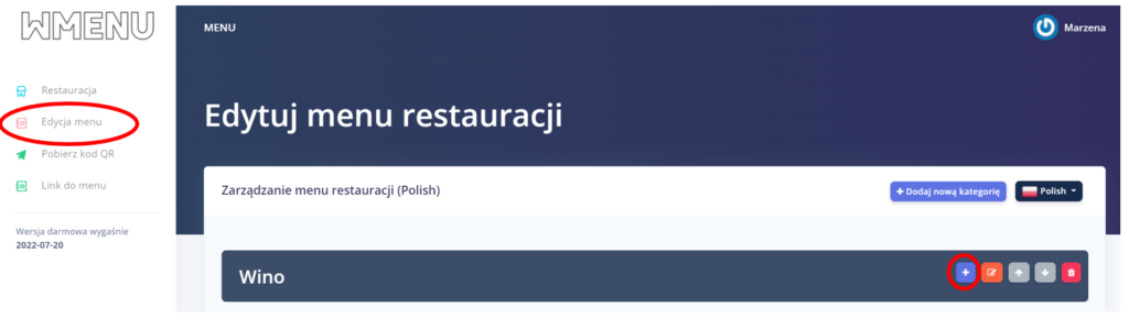 1. Aby dodać nowe danie (lub produkt z bazy centralnej serwisu) przejdź do sekcji „Edytuj menu” i następnie kliknij na przycisk „+” znajdujący się na belce kategorii.