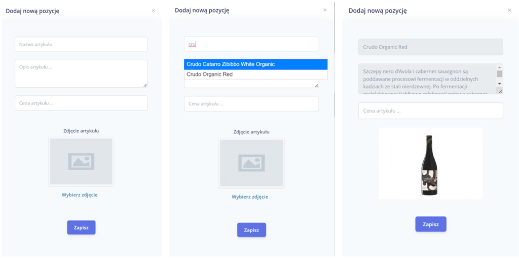 b. Jeśli po wpisaniu nazwy artykułu nie zostanie wyświetlony wartość, dodaj opis dania, cenę za podstawową porcje i zdjęcie jeśli posiadasz (koniecznie plik JPG). Zdjęcie jest opcjonalne.