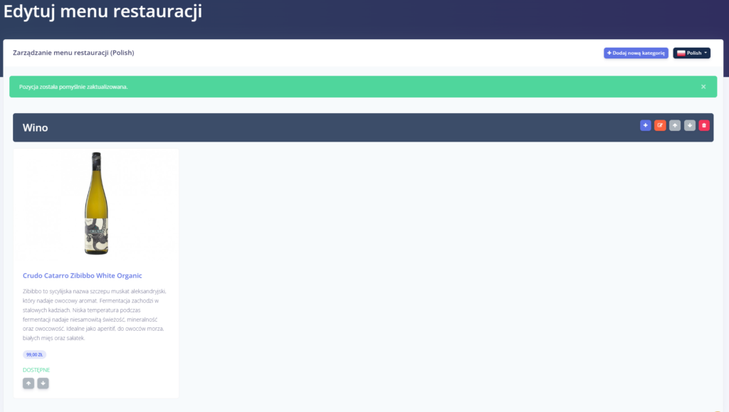 3. Prawidłowe dodanie dania lub produktu zostanie potwierdzone komunikatem na zielonej belce i asortyment będzie widoczny w danej kategorii w której go dodałeś.