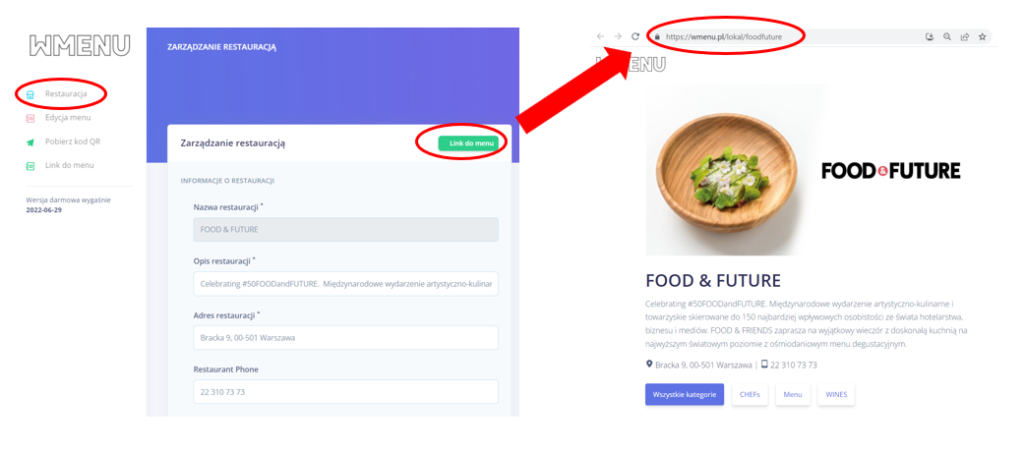 W pierwszym kroku skopiuj do schowka link do Twojego menu. Możesz to zrobić w sekcji „Restauracja” klikając na przycisk „Link do menu” i kopiując adres URL z nowo otworzonego okna przeglądarki z widocznym Twoim menu.