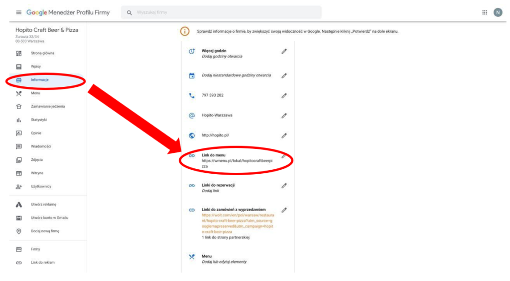 Po skopiowaniu do schowka linku do Twojego menu, otwórz Google Menedżer Profilu Firmy, przejdź do sekcji „Informacje” i w polu „Link do menu” wklej adres URL wcześniej skopiowany z przeglądarki.