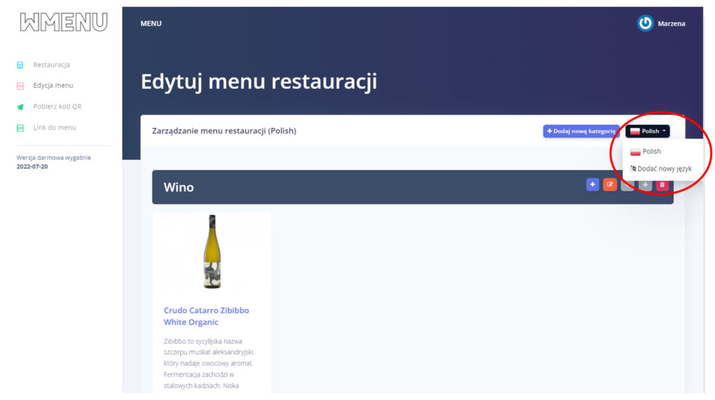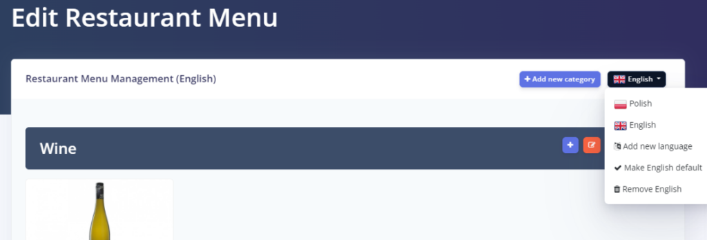 W tym momencie gdy dodatkowy język jest widoczny w liście rozwijanej po prawej stronie ekranu, wszystkie treści dotyczące dań zostały przetłumaczone na wybrany przez Ciebie język. W każdej chwili możesz dodać kolejny język, ale zachowaj umiar, aby nie przesadzić. Dodaj tylko te języki, które są niezbędne aby zachować czytelność menu.