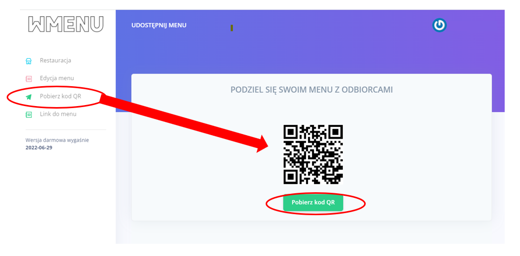 Aby pobrać kod QR wygenerowany dla Twojej restauracji wystarczy, że z menu głównego wybierzesz przycisk ”Pobierz kod QR”. Zostaniesz przekierowany na stronę gdzie unikalny kod QR dla Twojej restauracji będzie widoczny (możesz go zeskanować aplikacją aparat w telefonie), oraz klikając przycisk „Pobierz kod QR” zapisać na dysku w formacie pliku JPG do dalszego wykorzystania.